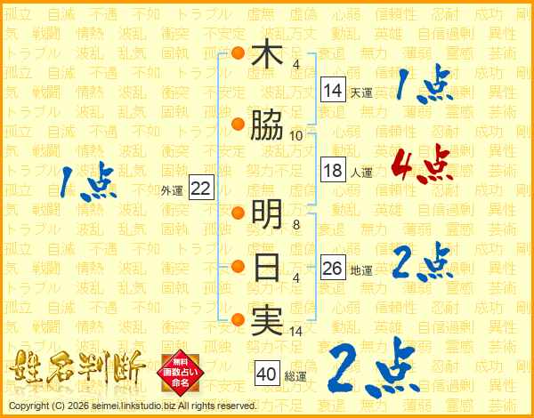 木(4画)脇(10画) 明(8画)日(4画)実(14画)