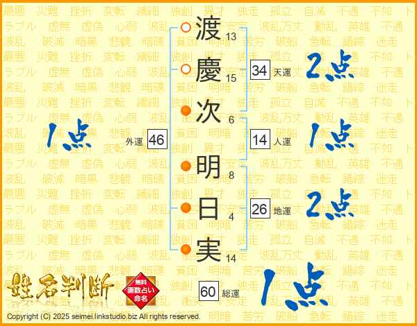 渡(13画)慶(15画)次(6画) 明(8画)日(4画)実(14画)
