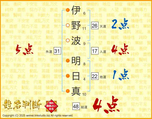 伊(6画)野(11画)波(9画) 明(8画)日(4画)真(10画)