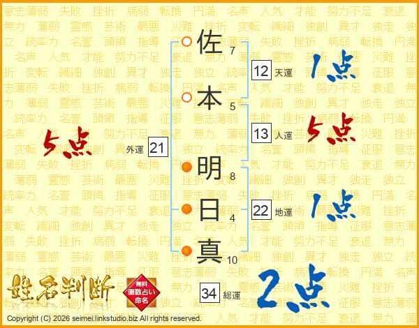 佐(7画)本(5画) 明(8画)日(4画)真(10画)
