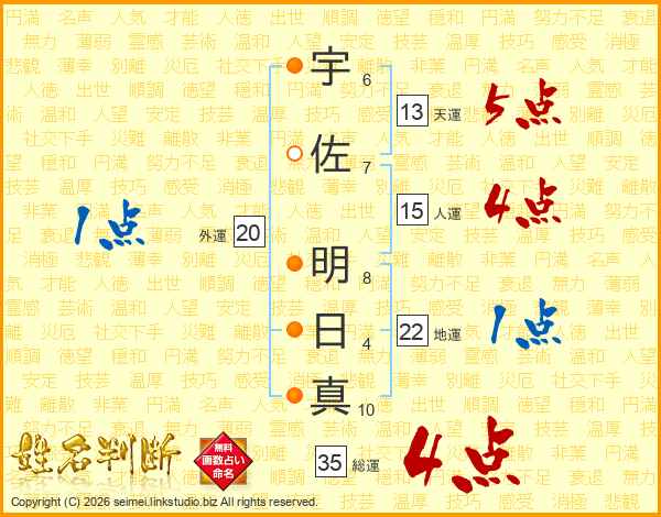 宇(6画)佐(7画) 明(8画)日(4画)真(10画)