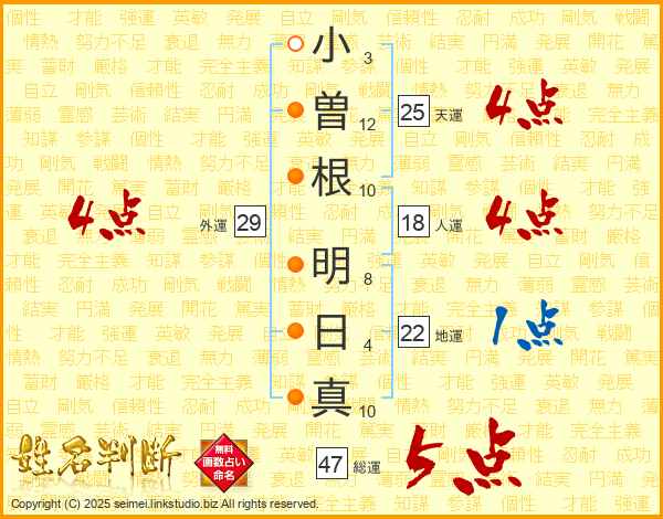 小(3画)曽(12画)根(10画) 明(8画)日(4画)真(10画)