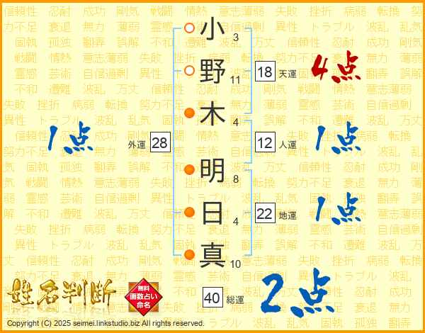 生活面を象徴する運勢です。外部から受ける影響力を表し、結婚運、家庭運や職場、環境への順応性を表します。総運から人運を引いた画数。姓や名が1文字の場合を除く。