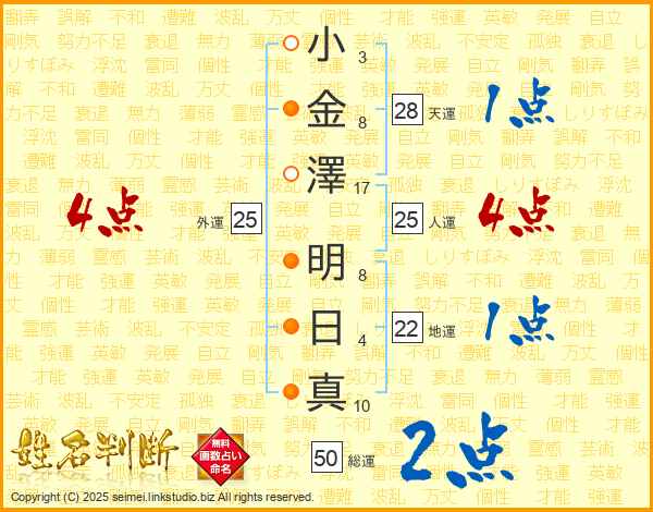 小(3画)金(8画)澤(17画) 明(8画)日(4画)真(10画)