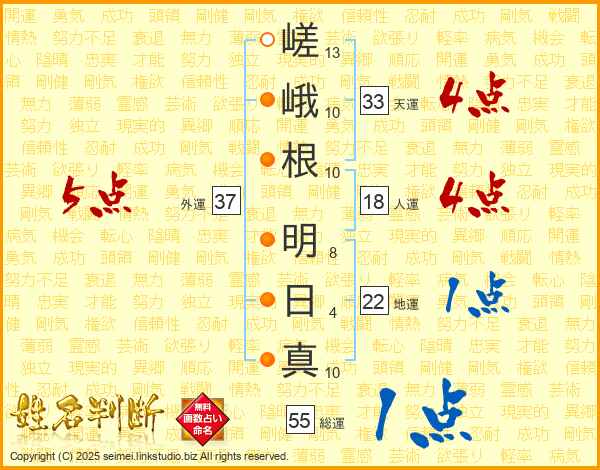 嵯(13画)峨(10画)根(10画) 明(8画)日(4画)真(10画)