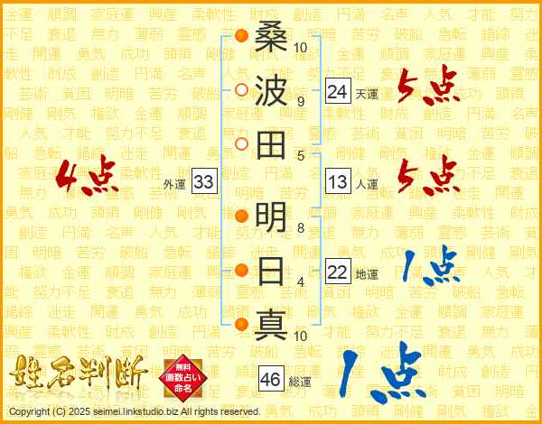 桑(10画)波(9画)田(5画) 明(8画)日(4画)真(10画)