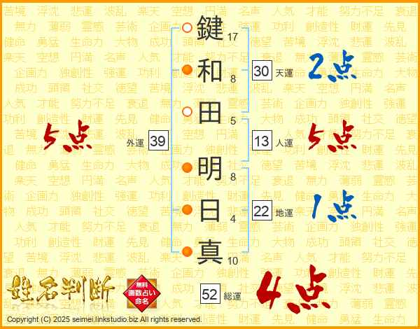 鍵(17画)和(8画)田(5画) 明(8画)日(4画)真(10画)