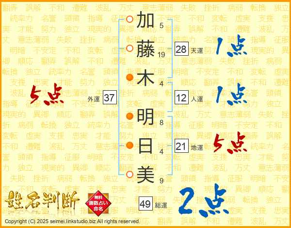 加(5画)藤(19画)木(4画) 明(8画)日(4画)美(9画)