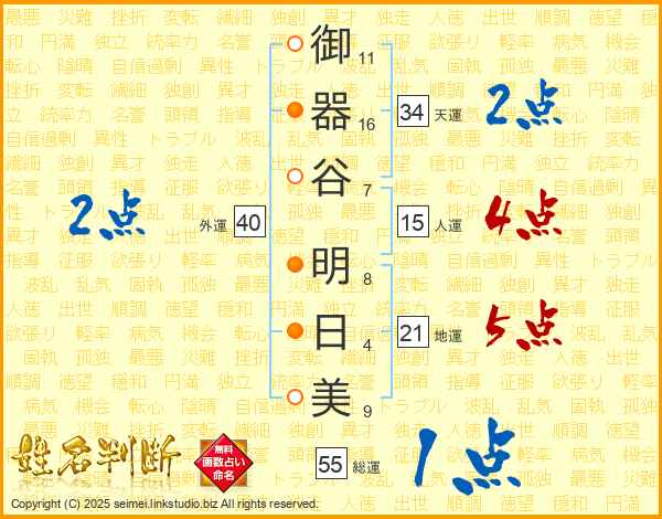 御(11画)器(16画)谷(7画) 明(8画)日(4画)美(9画)