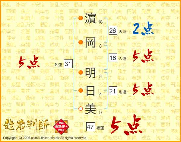 濵(18画)岡(8画) 明(8画)日(4画)美(9画)