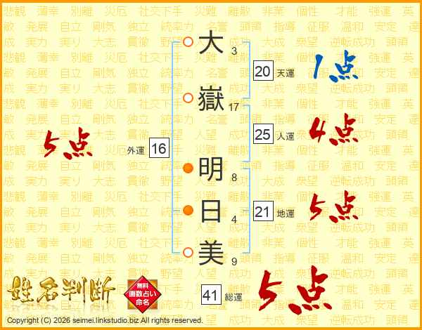 大(3画)嶽(17画) 明(8画)日(4画)美(9画)