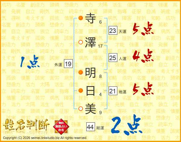 寺(6画)澤(17画) 明(8画)日(4画)美(9画)