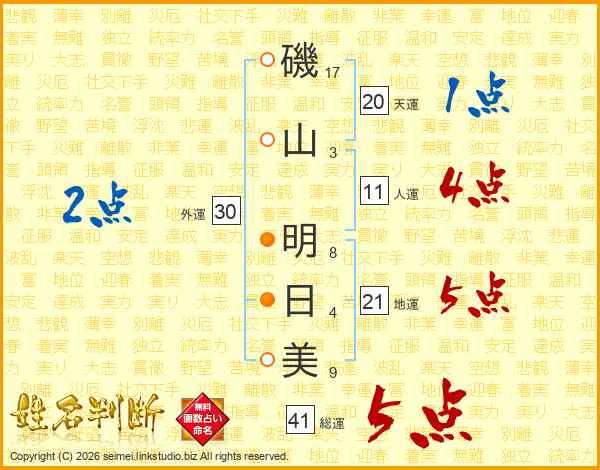 磯(17画)山(3画) 明(8画)日(4画)美(9画)