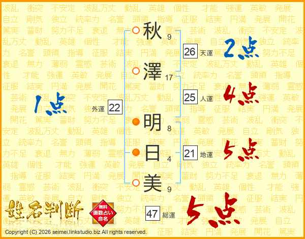 秋(9画)澤(17画) 明(8画)日(4画)美(9画)