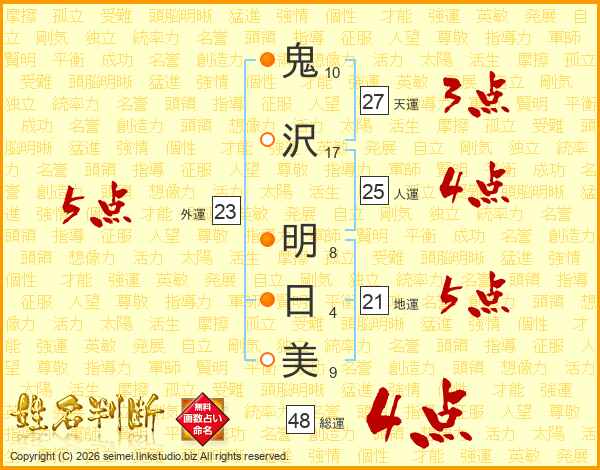 鬼(10画)沢(17画) 明(8画)日(4画)美(9画)