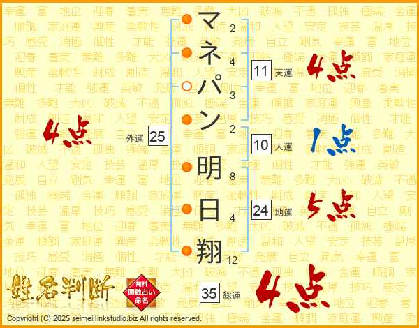 マ(2画)ネ(4画)パ(3画)ン(2画) 明(8画)日(4画)翔(12画)