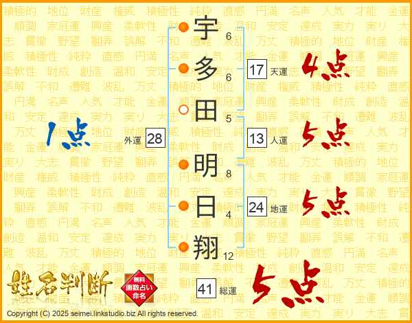 宇(6画)多(6画)田(5画) 明(8画)日(4画)翔(12画)