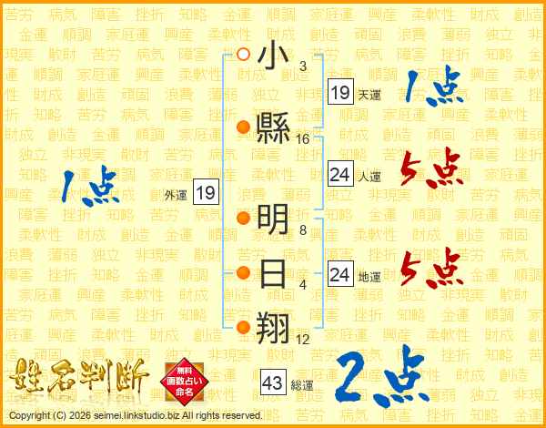 小(3画)縣(16画) 明(8画)日(4画)翔(12画)