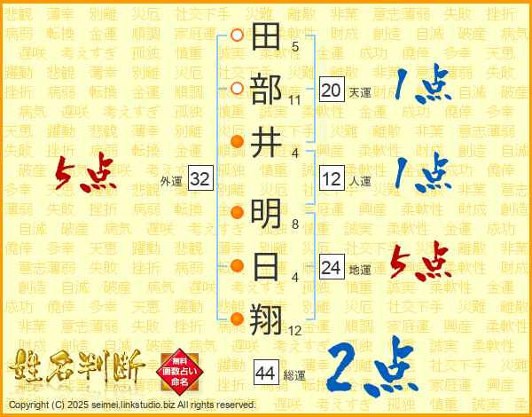 田(5画)部(11画)井(4画) 明(8画)日(4画)翔(12画)
