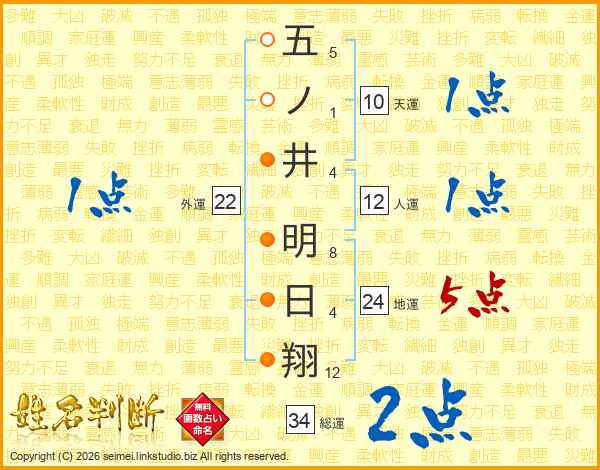 五ノ井明日翔さんの総運は34画の2点!