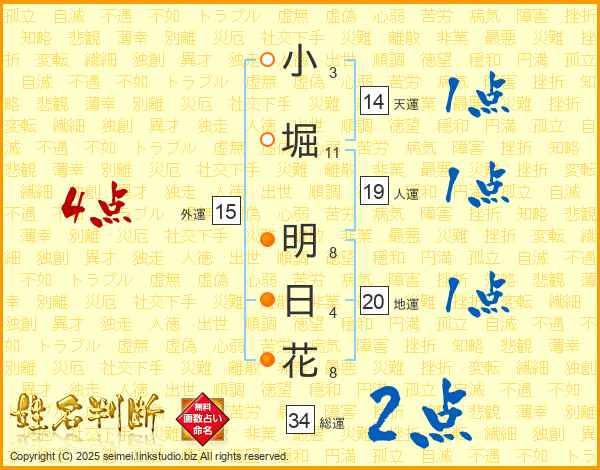 小(3画)堀(11画) 明(8画)日(4画)花(8画)