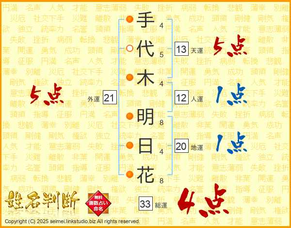 手(4画)代(5画)木(4画) 明(8画)日(4画)花(8画)