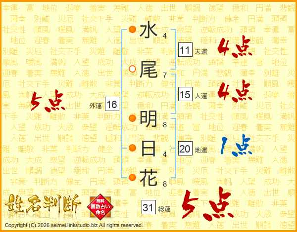水(4画)尾(7画) 明(8画)日(4画)花(8画)
