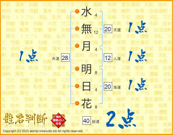 水(4画)無(12画)月(4画) 明(8画)日(4画)花(8画)