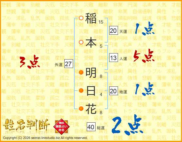 稲(15画)本(5画) 明(8画)日(4画)花(8画)