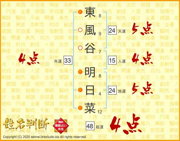 東(8画)風(9画)谷(7画) 明(8画)日(4画)菜(12画)