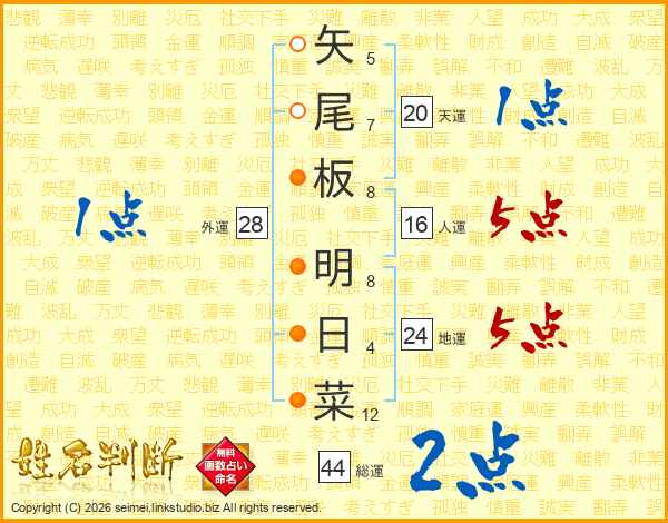 矢尾板明日菜さんの総運は44画の2点!