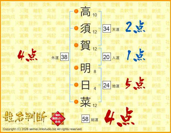 高須賀明日菜さんの総運は58画の4点!
