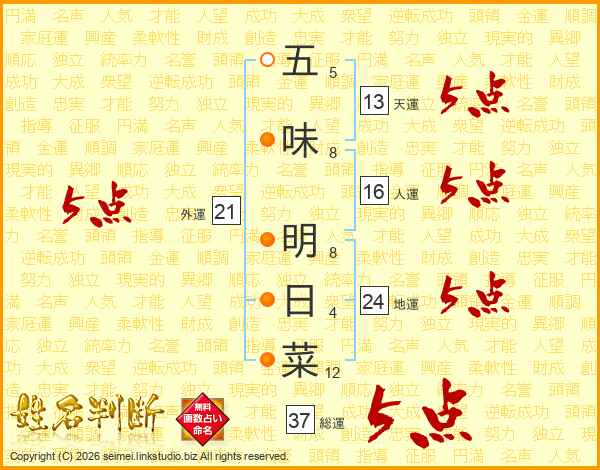 五味明日菜さんの外運は21画の5点!