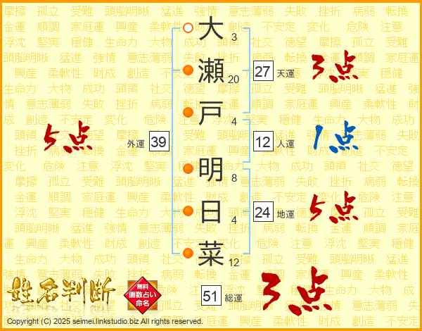大(3画)瀬(20画)戸(4画) 明(8画)日(4画)菜(12画)
