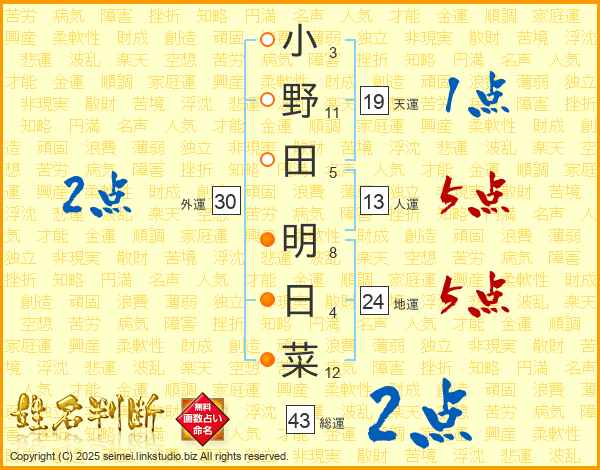 小(3画)野(11画)田(5画) 明(8画)日(4画)菜(12画)