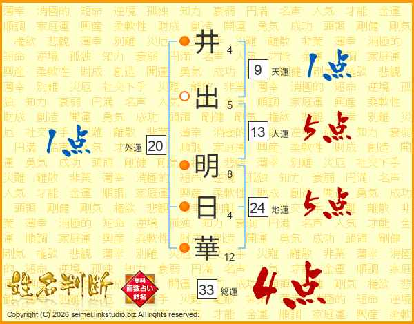 井(4画)出(5画) 明(8画)日(4画)華(12画)