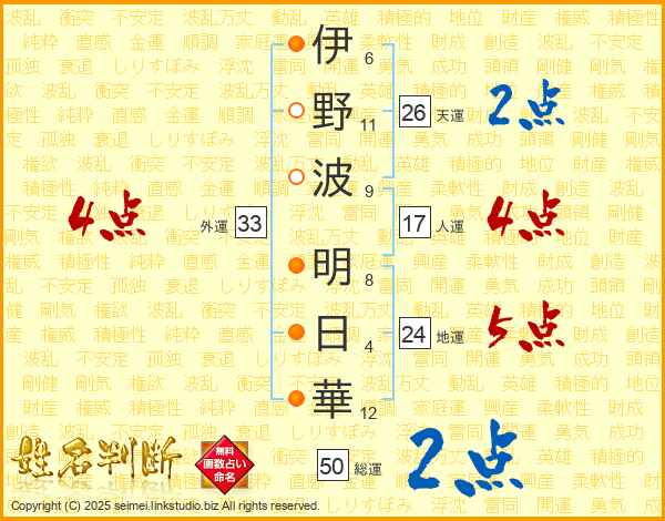 伊(6画)野(11画)波(9画) 明(8画)日(4画)華(12画)