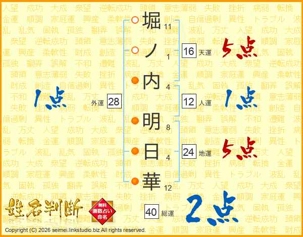堀(11画)ノ(1画)内(4画) 明(8画)日(4画)華(12画)