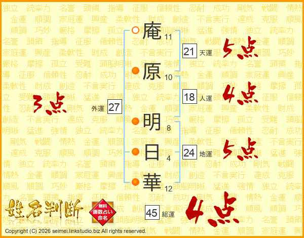 庵(11画)原(10画) 明(8画)日(4画)華(12画)
