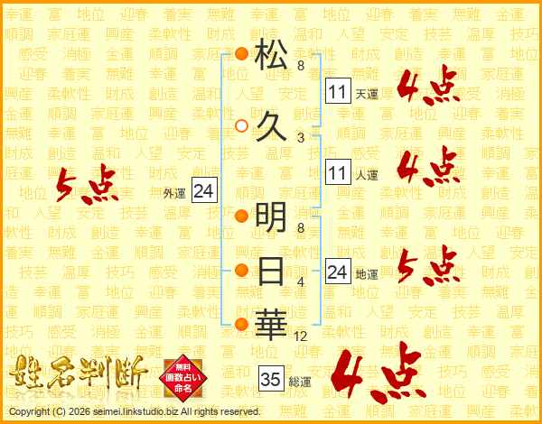 松(8画)久(3画) 明(8画)日(4画)華(12画)
