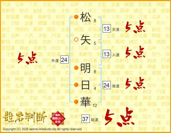 松(8画)矢(5画) 明(8画)日(4画)華(12画)