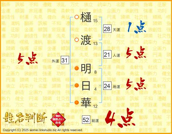樋(15画)渡(13画) 明(8画)日(4画)華(12画)