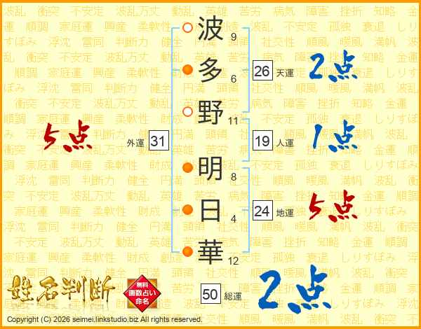 波(9画)多(6画)野(11画) 明(8画)日(4画)華(12画)