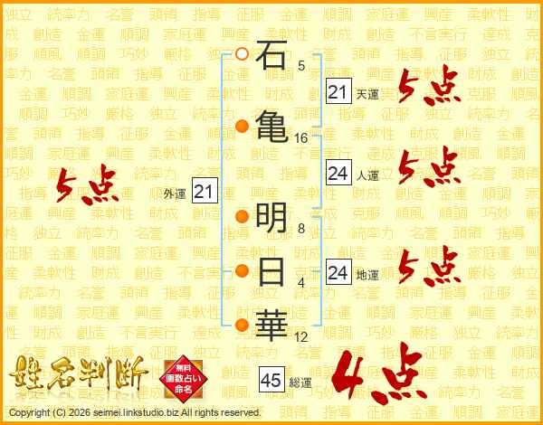 石(5画)亀(16画) 明(8画)日(4画)華(12画)