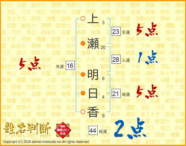 上(3画)瀬(20画) 明(8画)日(4画)香(9画)