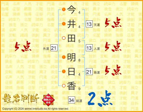 今(4画)井(4画)田(5画) 明(8画)日(4画)香(9画)