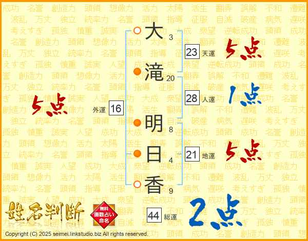 大(3画)滝(20画) 明(8画)日(4画)香(9画)