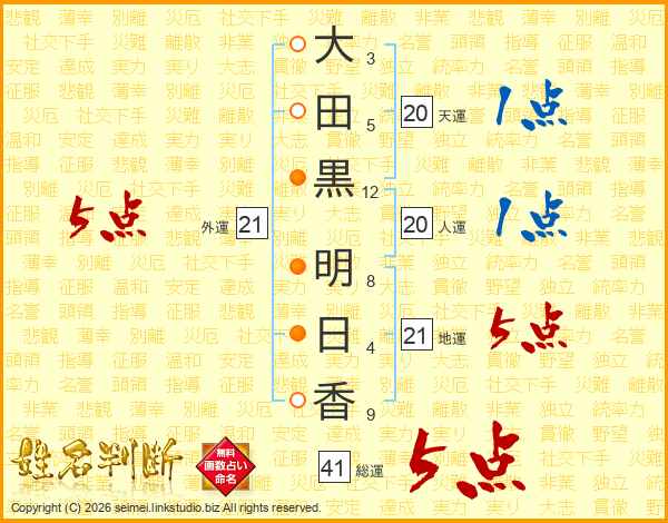 大田黒明日香さんの総運は41画の5点!