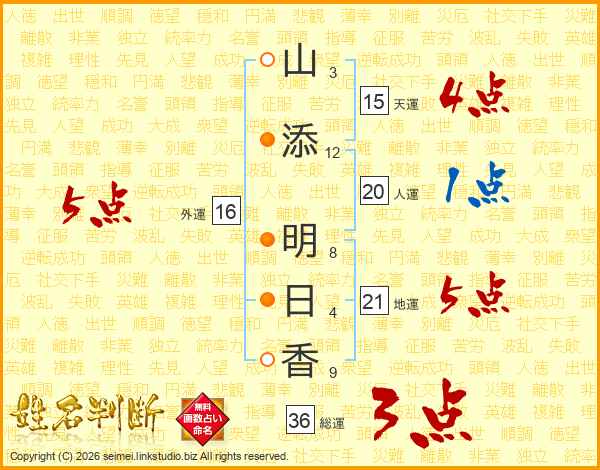 山(3画)添(12画) 明(8画)日(4画)香(9画)