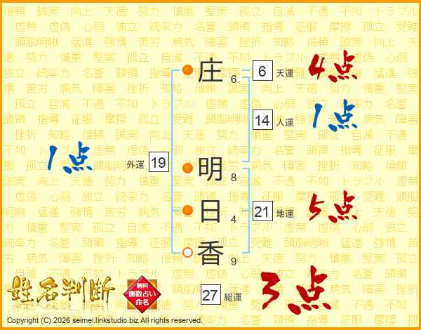 庄(6画) 明(8画)日(4画)香(9画)